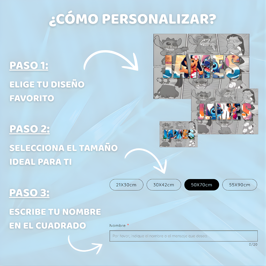 Personalizar tu cuadro es muy sencillo: primero elige tu diseño favorito, después selecciona el tamaño que mejor encaje contigo y, por último, escribe el nombre o mensaje que quieras en el cuadro. Nosotros nos encargamos de transformarlo en un cuadro único, hecho especialmente para ti.
