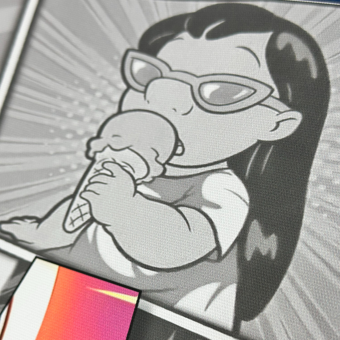 Cada creación comienza con una realización manual para un resultado único, luego se digitaliza e imprime en lienzo artístico con tintas UV resistentes para una calidad de museo. Pero el producto final es una impresión premium.